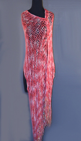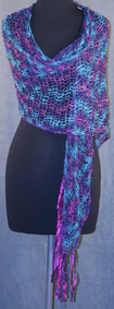 RIBBONED STOLE Hand-dyed silk/mohair blend creates an elegant effect of variegated colors in this ribbon-fringed accessory. This versatile piece may be worn in three styles: Pointed (buttoned on shoulder with point in front), Looped (buttoned on shoulder in loose fold), or Draped (over both shoulders). The Ribboned Stole design reflects the ancient, colorful mantles with delicate folds worn by the early Celts. Festive ribbons parallel the Celtic love for life and frivolity! Available only at retail shows.